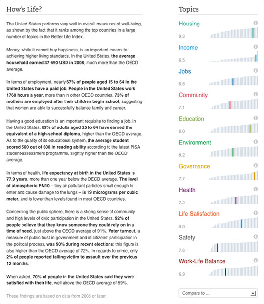 On the left, words are used to provide the narrative, while on the right a visual display makes it easy to see how the United States compares to the other countries at a glance. The series of small vertical bars next to each label (Housing, Income, etc.) represents in miniature the values associated with each country ranked from lowest to highest, with the highlighted bar representing the United States. These tiny graphs tell a rich story in little space. Consider Safety for a moment. Not only can we quickly see that the United States is near the bottom with a score of 7.6 out of 10, but that most countries score within a narrow range, with two significant exceptions represented by the lowest bars on the left. Scanning the various measures, I quickly spot that our highest score relative to the other countries is Income (ranked second), but the score of 6.5 is much lower than the highest country. By hovering over the tallest bar a pop-up display tells me that Luxembourg leads the pack with a perfect Income score of 10.