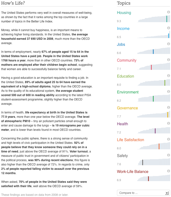 As a citizen of the United States, I was interested in seeing how our quality of life here compares to other OECD countries. By clicking on the flower that represents the United States, I was able to view this information as follows: