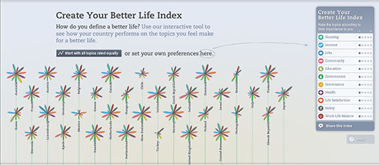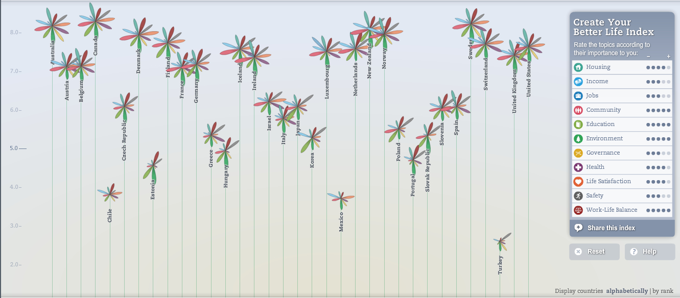 An excellent post. I think the Better Life Index is a great tool. I was also struck by how well the glyph works. As you say, it wouldn’t succeed if it was not supported by the rich depth of easily accessible material elsewhere on the site.
