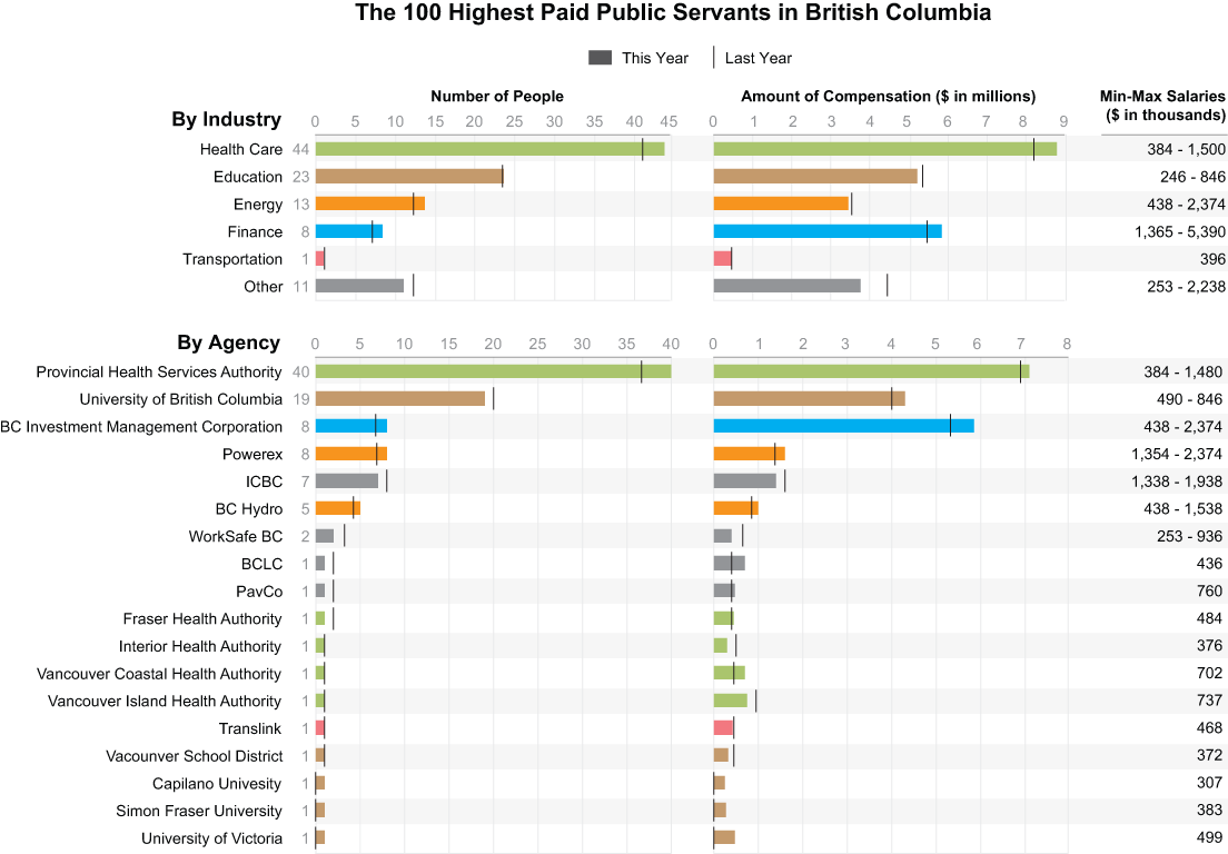 I wrote to Skelton and offered to demonstrate that a bar graph of this content need not be boring if he would kindly send me the information on which his packed bubbles chart was based. I requested all of the information that was available (apparently this information about public servant salaries resides in a publicly available database) about these agencies, salaries, etc., both current and past. Skelton graciously responded by sending the data, but only what he used to produce his own chart: the list of agencies and number of employees in each who earned the top 100 salaries. This information alone is of limited interest. As a Vancouver resident, I would want to know how this year was different from the past and not just the numbers of people, but also the amounts that they were paid. As Edward Tufte wrote long ago, “If the statistics are boring, then you’ve got the wrong numbers.” A chart of any type that contains this information alone will generate relatively little interest. Perhaps Skelton displayed it as packed bubbles rather than a bar graph to camouflage the fact that the information is rather limp. Dressing up a chart in glitter and spangles to generate interest that doesn’t exist in the information itself treats readers disrespectfully. In The Elements of Style, Strunk and White wrote: “No one can write decently who is distrustful of the reader’s intelligence, or whose attitude is patronizing.” I agree.