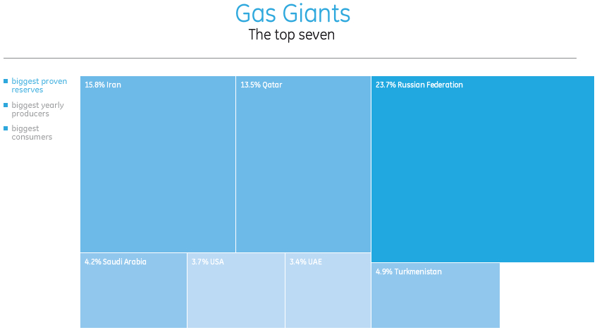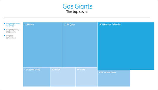 The only things you can’t see here that are available in the original visualization on GE’s website are the names of the countries (one per square) that appear only as you hover over them. What we see here looks like an oddly designed version of a treemap, with only one dimension of data (the relative sizes of the squares, which in this case represent the amounts of natural gas left per country) rather than two dimensions (using varying color intensities as well to display a second set of values). Unlike a true treemap, however, the squares do not fill the space, which raises the question: “What do the white spaces mean?”